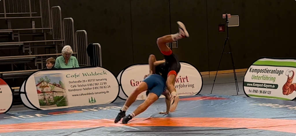 Bis 130 Kg im Schwergewicht standen sich Ibrahimov Toghrul und Fabio Alielo gegenüber nach einer Blitz schnellen Schwunggriff Aktion überrascht der Unterföhringer Ringer denn Gast Toghrul und schulterte ihn.